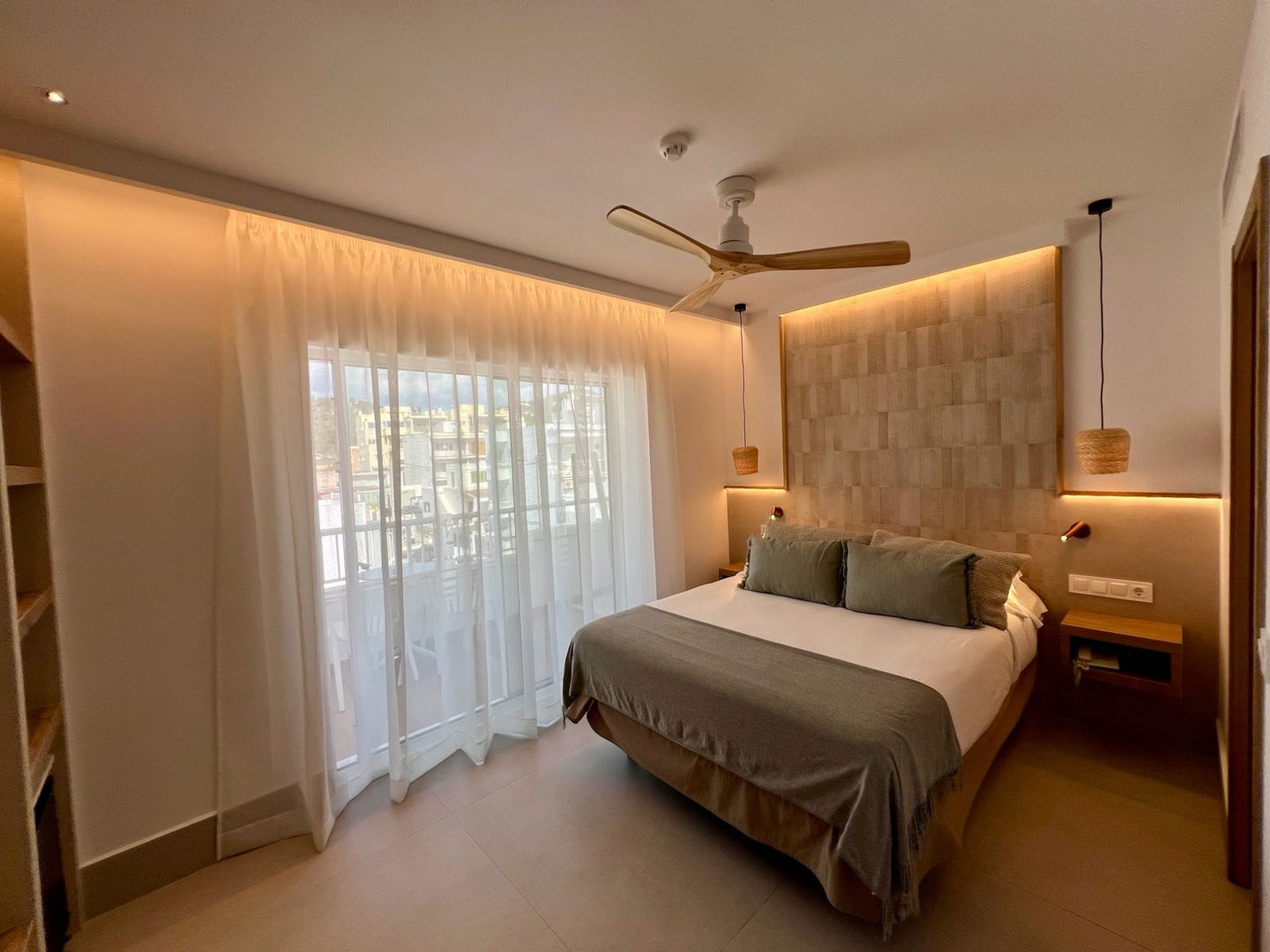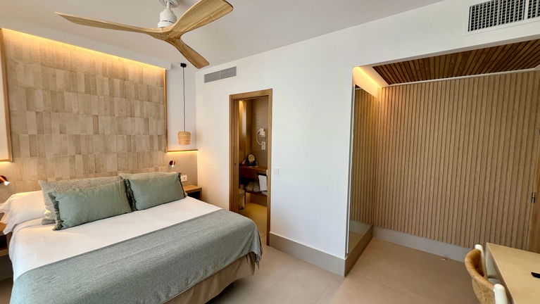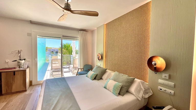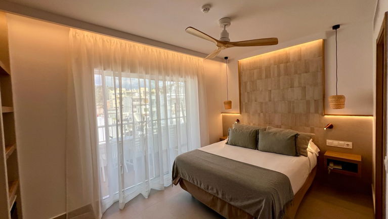 Camera ristrutturata, letto matrimoniale e terrazza con vista mare.